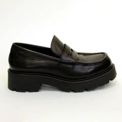 Add a chunky addition to your shoe edit this season with online exclusive loafer style Cosmo 2.0. The all-black upper is made from smooth, polished leather set on a 45mm heel for a subtle lift. Details include the classic, visible stitching and the contoured penny straps across the foot.