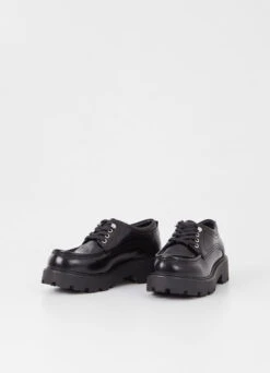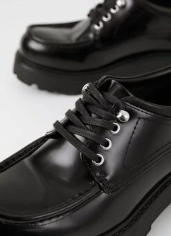 Cosmo 2.0 is the chunky low shoes with inspiration from our archives. The style is crafted in black polished leather featuring moc-toe details, lace-up fastening and silver-toned eyelets. The chunky heels measure 45mm.